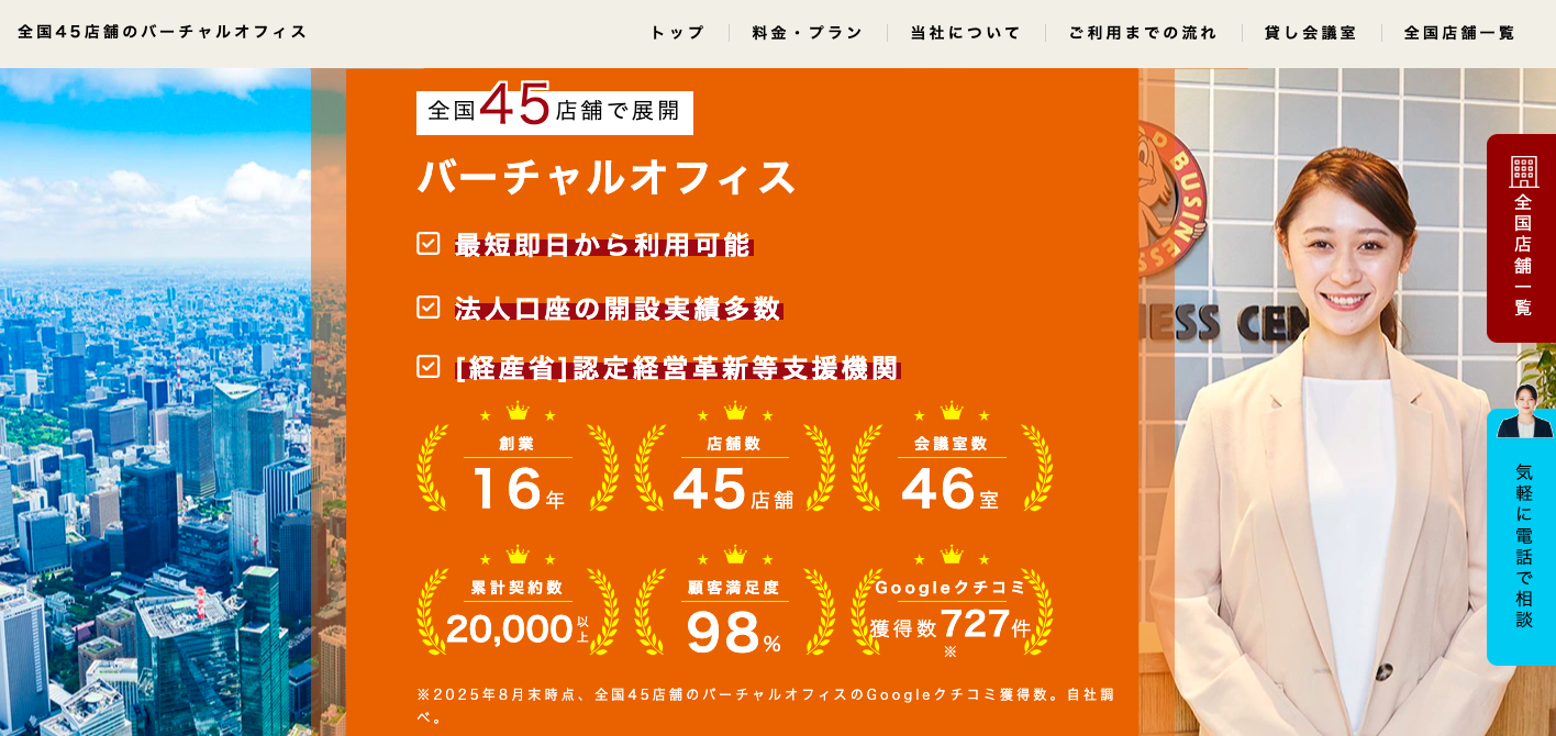ワンストップビジネスセンターは東京23区内をはじめ、北海道から九州まで全国45拠点を展開し、創業16年・累計契約数20,000件を超える実績を持つ大手バーチャルオフィスです。