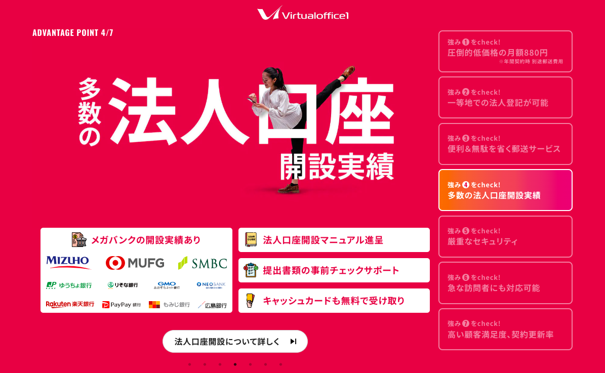 口座開設のハードルが高い中で実績があるバーチャルオフィスは大きな安心材料となります。